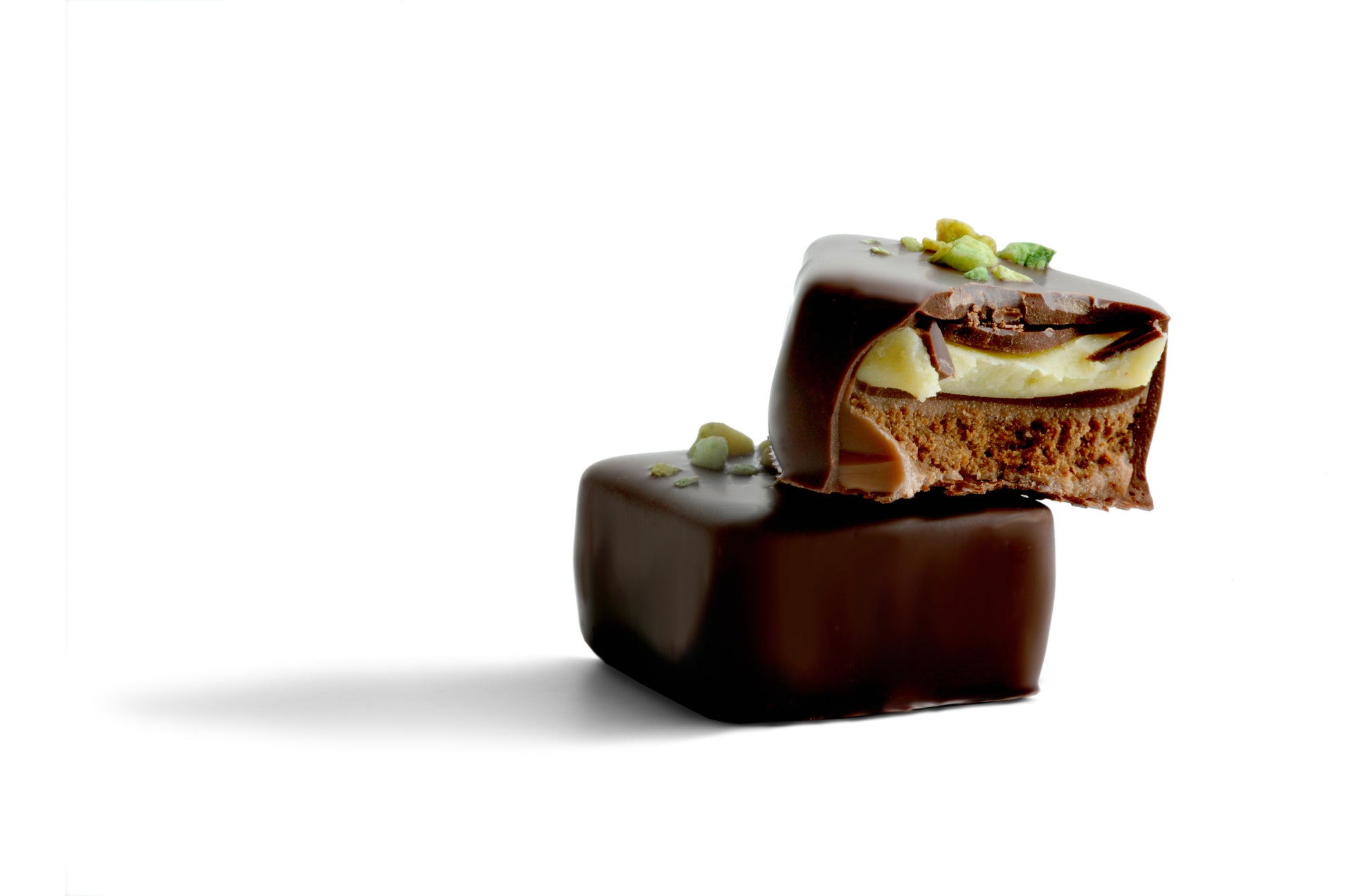 Praliné amande de Sicile et noisette du Piémont, ganache à la pistache, chocolat noir.